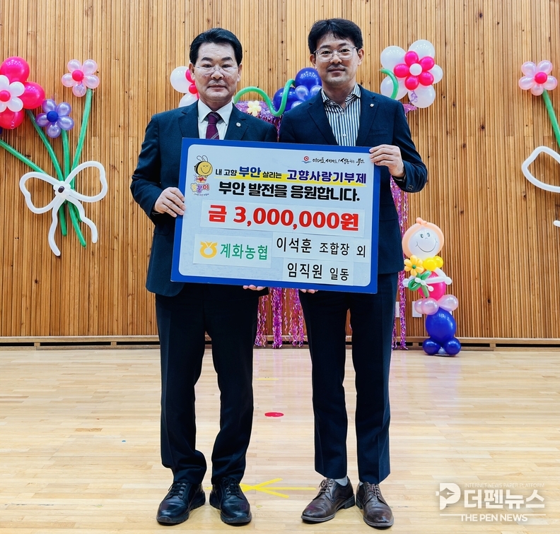 부안군은 지난 10월 31일, 계화농협(조합장 박문수)이 고향사랑기부금 300만 원을 기탁했다고 밝혔다. 이번 기탁식은 계화면 종합복지센터 체육관에서 열린 ‘효잔치 행사’와 함께 진행되어 지역사회에 따뜻한 의미를 더했다.