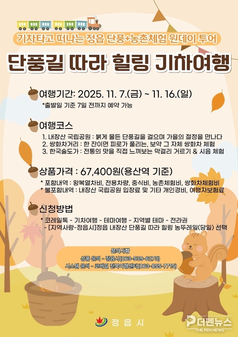 가을 여행 성수기를 맞아 정읍시가 내장산 단풍과 농촌체험을 결합한 특별 기차여행 상품 ‘농뚜레일 투어’를 선보인다.