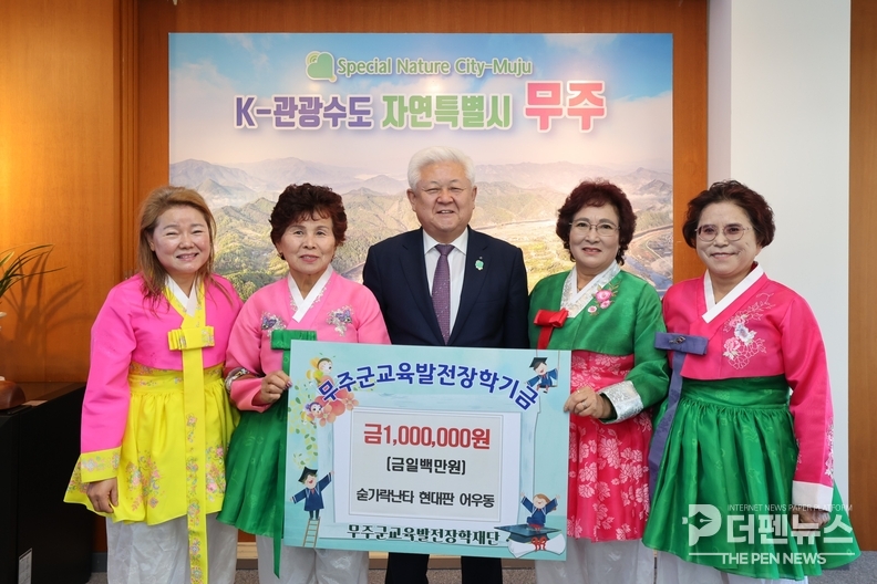 무주군 숟가락 난타 동호회 ‘현대판 어우동’팀이 지난 3일 (재)무주군교육발전장학재단에 장학금 1백만 원을 기탁하며 지역 청소년 지원에 나섰다.