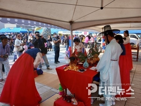 특히 이번 행사의 하이라이트는 실제 신랑과 신부가 참여한 전통혼례 재현이었다.전안례(傳鷃禮), 교배례(交拜禮), 서천지례(誓天之禮), 서배우례(誓拜于禮), 근잔례(覲盞禮) 등 혼례 절차가 전통 방식으로 정갈하게 진행되며 관람객들에게 옛 혼례문화의 품격과 의미를 생생히 전했다.
