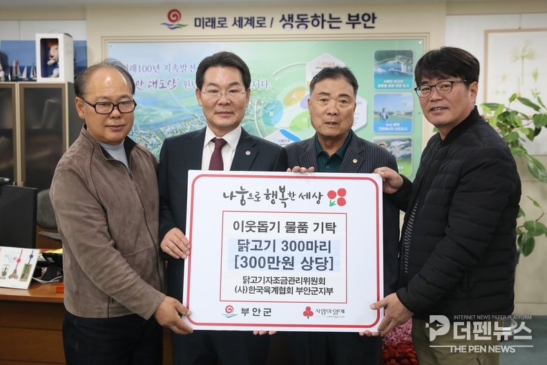 권익현 부안군수는 “어려운 이웃을 위해 따뜻한 정을 나눠주신 한국육계협회 부안군지부에 깊은 감사를 드린다”며 “기탁된 닭고기는 소외계층이 협회의 온정을 느낄 수 있도록 소중히 전달하겠다”고 밝혔다.