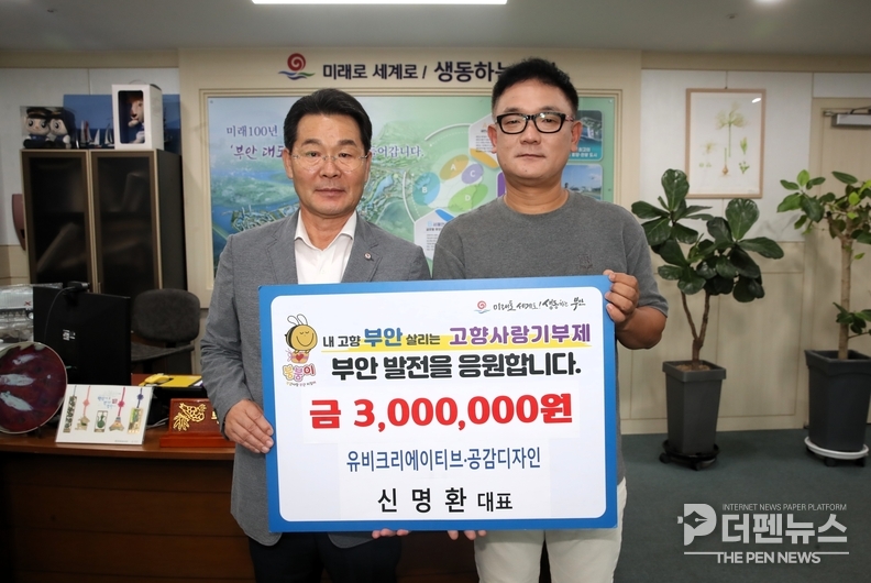 부안군은 최근 미디어 콘텐츠 매니지먼트 기업 ‘유비크리에이티브’와 디자인 전문업체 ‘공감디자인’을 운영하고 있는 신명환 대표가 300만원의 고향사랑기부금을 기탁했다고 밝혔다.