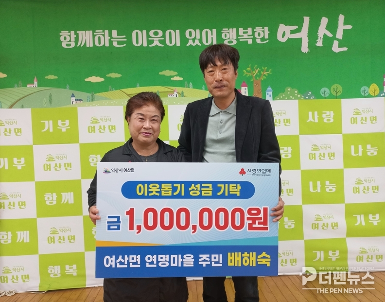 익산시 여산면은 10일 연명마을 거주 배해숙(63) 씨가 여산면 행정복지센터를 방문해 이웃돕기 성금 100만 원을 기탁했다고 밝혔다.