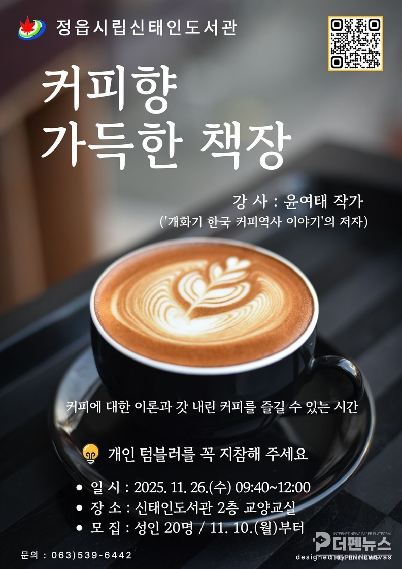 신태인도서관 관계자는 “평소 즐겨 마시는 커피의 종류와 그 속에 담긴 역사를 새롭게 배울 수 있는 유익한 시간이 될 것”이라며 “가을 풍경 속 도서관에서 책과 커피 향을 함께 즐기며 힐링하는 시간이 되길 바란다”고 전했다.