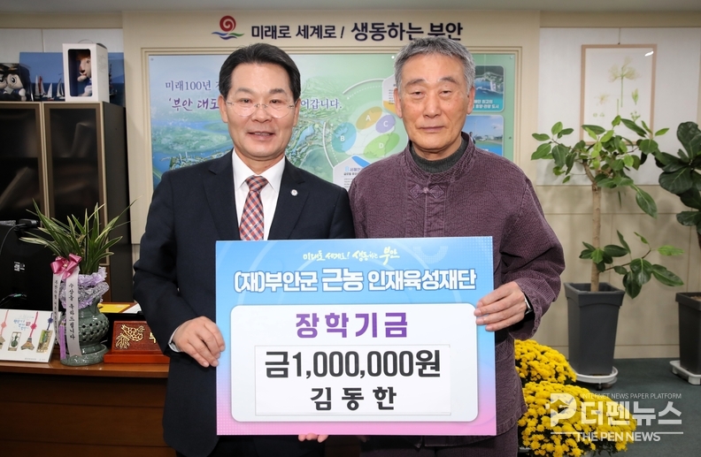 부안군 퇴직공무원 김동한 씨가 지난 18일 지역 인재 육성을 위해 부안군근농인재육성재단에 장학금 100만 원을 기탁했다.