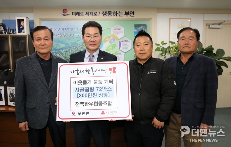 권익현 부안군수는 “뜻깊은 나눔을 실천해 주신 전북한우협동조합에 깊이 감사드린다”며 “기탁해 주신 사골곰탕은 도움이 필요한 이웃들에게 따뜻한 마음과 함께 잘 전달하겠다”고 말했다.