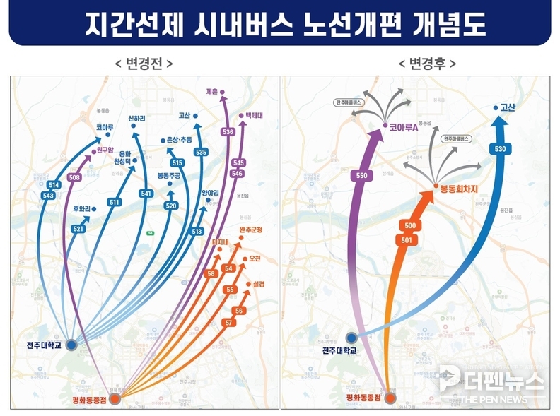 구체적으로 500번과 501번 노선이 신설돼 기존 △54번 △55번 △56번 △57번 △58번 노선을 대체하며, 평화동종점에서 봉동회차지까지 운행된다. 또 550번 노선이 신설돼 △508번 △536번 △542번 △545번 △546번 노선을 대신해 평화동종점에서 코아루아파트까지 균일한 간격으로 운행된다.