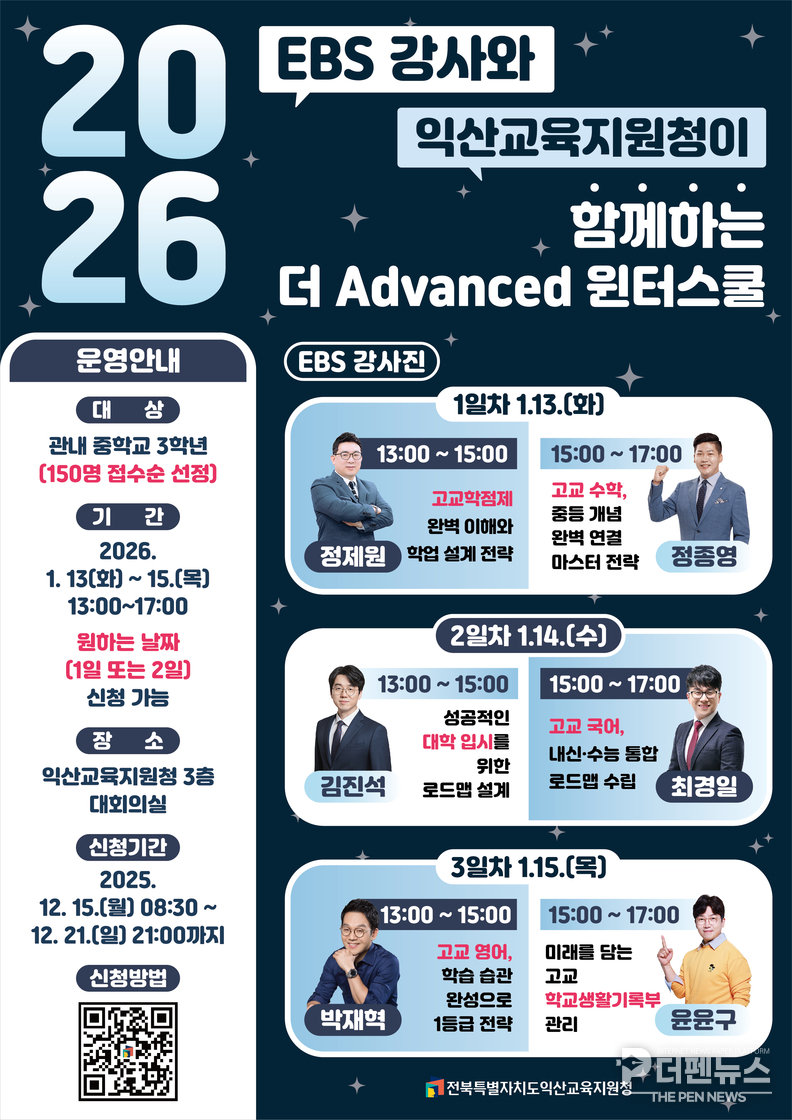 전북특별자치도익산교육지원청(교육장 정성환)은 예비 고1 학생을 위한 ‘2026년 더 Advanced 윈터스쿨’을 개최합니다.