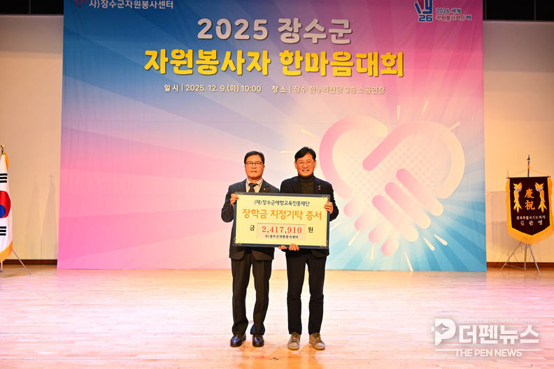 장수군자원봉사센터가 지역 인재 육성을 위해 (재)장수군애향교육진흥재단에 장학금을 기탁했다. 장수군은 9일 열린 ‘장수군 자원봉사자 한마음대회’에서 자원봉사센터가 약 240만원의 장학금을 전달했다고 밝혔다.