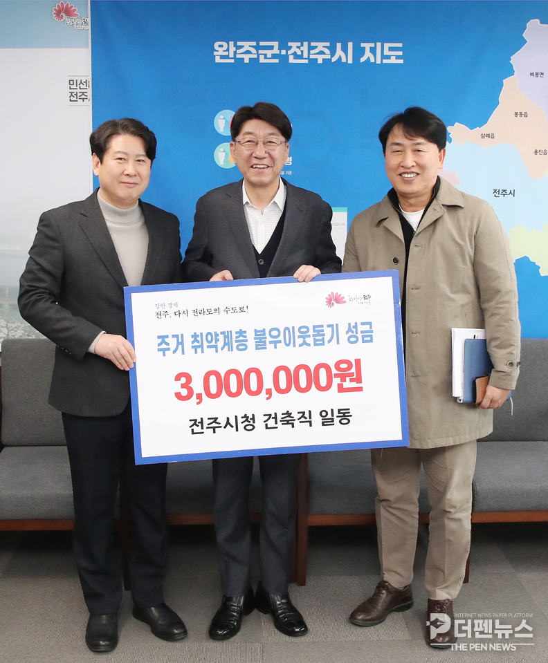 전주시는 10일 시청에서 전주시 소속 건축직 공무원들이 겨울철 취약계층의 안전한 주거생활을 위해 독거노인 가구 주거환경 개선 성금을 기탁했다고 밝혔다.