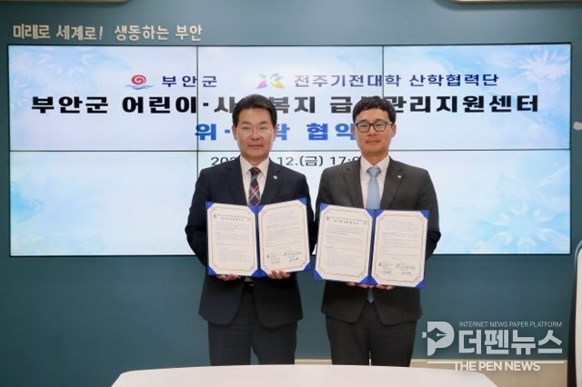 부안군은 최근 군청에서 전주기전대학 산학협력단과 ‘부안군 어린이·사회복지급식관리지원센터’ 위탁 운영을 위한 협약을 체결했다고 밝혔다. 협약식에는 권익현 부안군수와 조덕현 전주기전대학 산학협력단 단장, 관계 공무원 등이 참석했다.