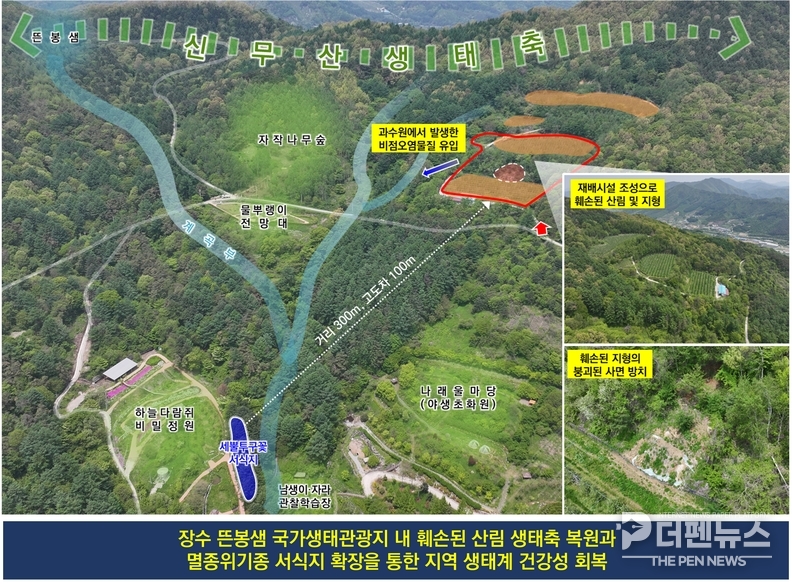 장수군은 확보한 국비를 활용해 뜬봉샘 국가생태관광지 내 과거 개간사업으로 조성된 폐과수원 일대를 중심으로 훼손된 산림과 지형을 복원하고, 단절된 산림 생태축을 회복할 계획이다. 해당 구간은 과수원 조성 과정에서 지형 훼손이 발생하고 비점오염물질 유입 우려가 제기돼 왔던 지역으로, 체계적인 생태 복원이 필요하다는 지적을 받아왔다.