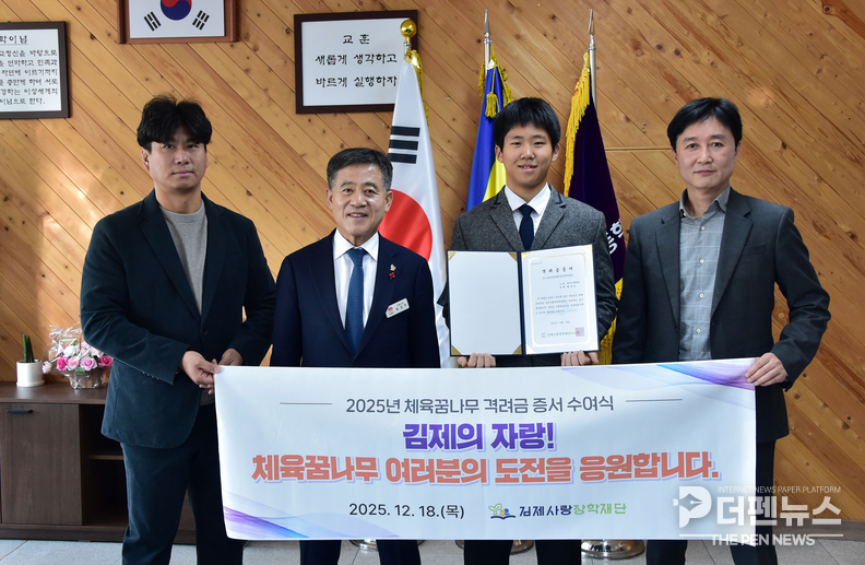 김제시는 18일 김제사랑장학재단이 제106회 전국체육대회에서 우수한 성적을 거둔 학생들에게 ‘체육꿈나무 격려금’을 수여하며 지역 체육 인재 양성 의지를 재확인했다고 밝혔다.