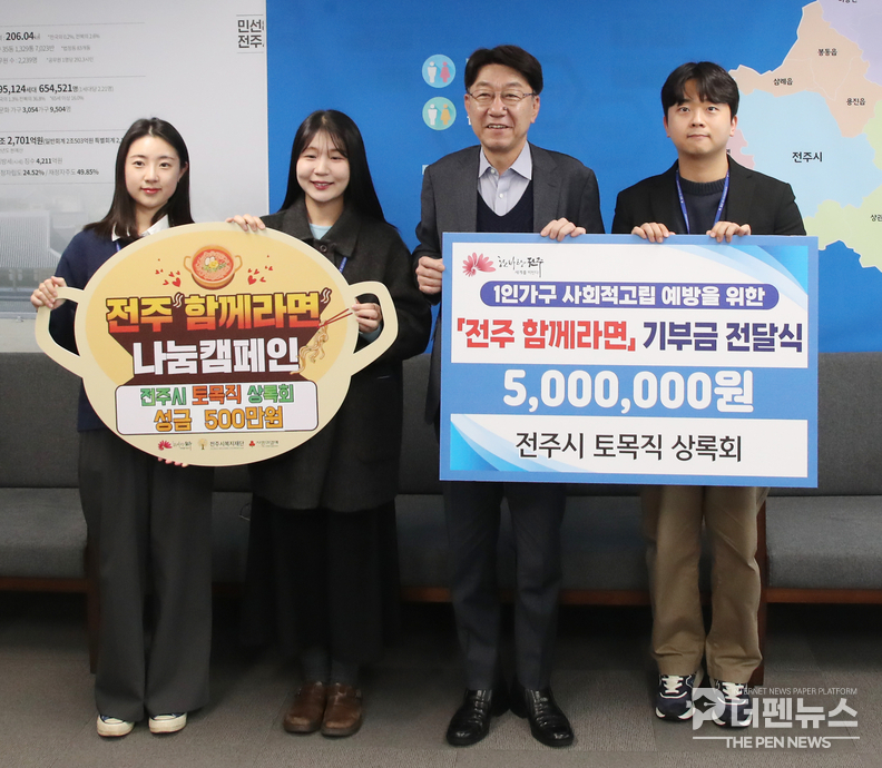 전주시 토목직 공무원으로 구성된 전주시 토목직 상록회(회장 임정빈 광역도시조성과장)는 17일 고립·위기가구를 지원하는 전주형 나눔캠페인 ‘전주 함께라면’ 추진을 위해 성금 500만 원을 전주시에 기부했다.