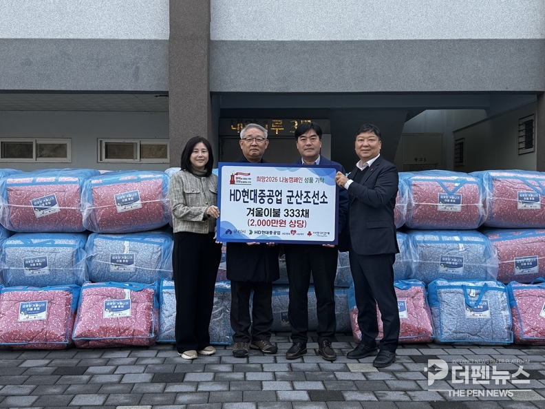 HD현대중공업 군산조선소는 최근 군산시에 겨울 이불 333채(2,000만 원 상당)를 기탁했다고 밝혔다. 이번 기탁은 연말연시 이웃돕기 모금 활동인 ‘희망 2026 나눔 캠페인’의 일환으로 마련됐다.