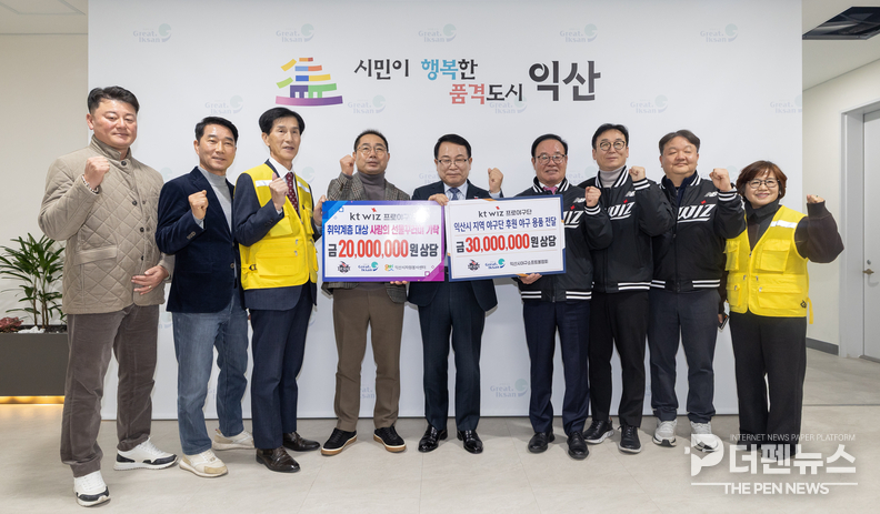 kt wiz 관계자는 22일 익산시청을 찾아 총 5,000만 원 상당의 야구용품과 생활용품을 기탁했다. 이날 전달된 물품은 지역 야구 꿈나무와 취약계층을 위해 사용될 예정이다.