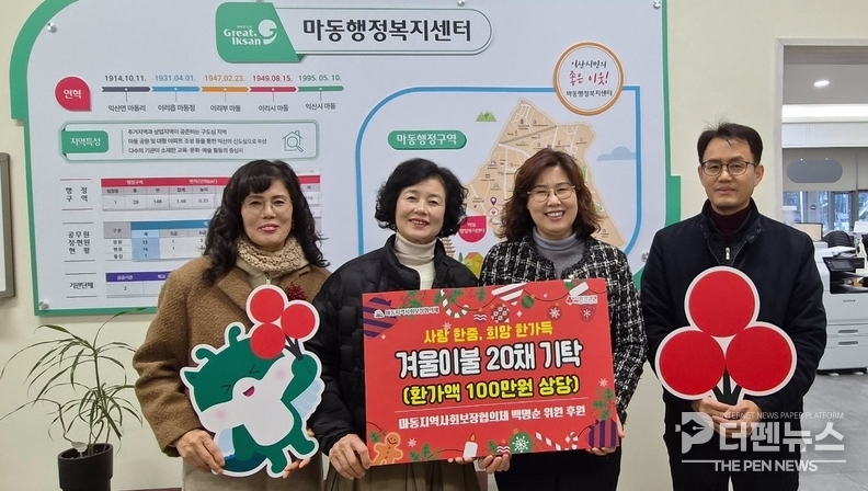 익산시 마동은 22일 백명순 마동 지역사회보장협의체 위원이 겨울 이불 20채(100만 원 상당)를 기탁했다고 밝혔다. 전달된 이불은 저소득 가구와 독거노인 등 취약계층 20가정에 지원될 예정이다.