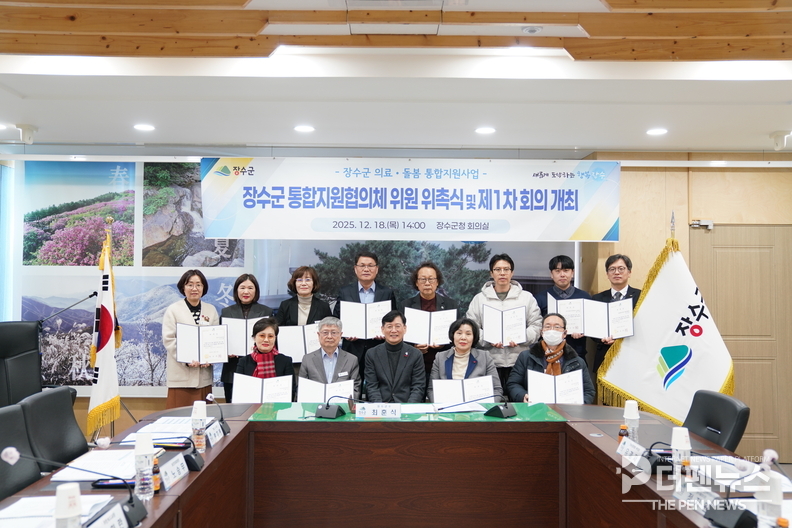 장수군은 지난 18일 군청 회의실에서 제1기 장수군 통합지원협의체 위원 위촉식과 제1차 회의를 열었다고 밝혔다. 이날 행사에는 관내 보건·복지·의료 분야 관계기관 전문가 14명이 참석해 향후 통합돌봄 추진 방향을 공유하고 협력 의지를 다졌다.