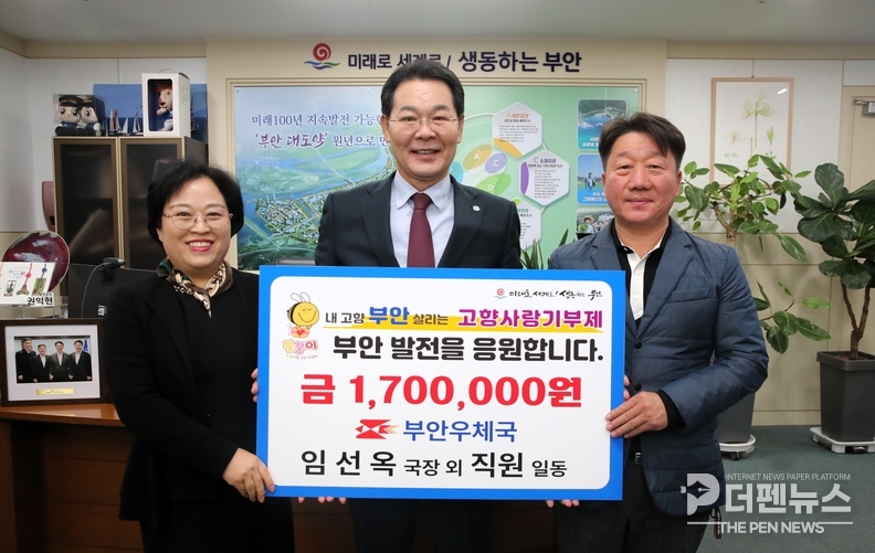 부안군은 최근 부안수협과 부안우체국이 고향사랑기부금을 기탁했다고 밝혔다. 부안수협은 230만 원, 부안우체국은 170만 원을 각각 기부하며 연말을 맞아 지역 사랑을 실천했다.