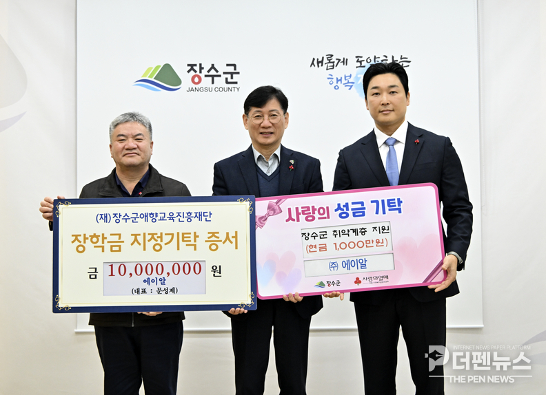 장수군은 ㈜에이알(대표 문성제)이 지난 19일 군청을 방문해 (재)장수군애향교육진흥재단에 장학금 1천만 원과 전북사회복지공동모금회를 통한 이웃돕기 성금 1천만 원 등 총 2천만 원을 전달했다고 밝혔다.