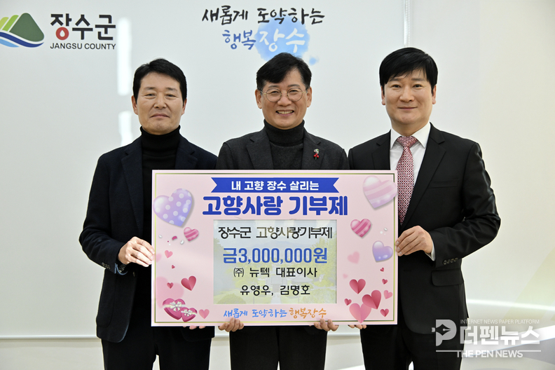 장수군은 23일 ㈜뉴텍 대표이사들이 고향사랑기부제를 통해 기부금을 전달했다고 밝혔다. 이번 기탁은 지역 발전에 직접 참여하고, 복지 증진과 공동체 기반 강화를 응원하기 위한 취지로 이뤄졌다.