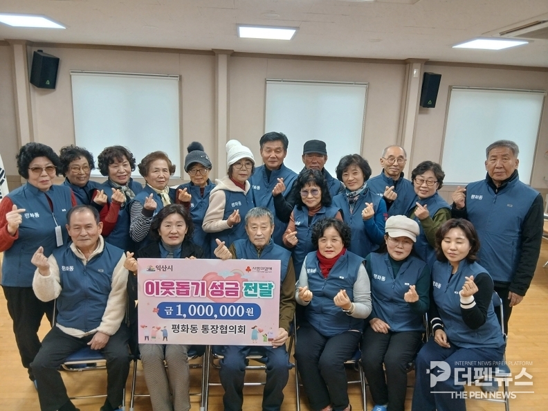 평화동 통장협의회(회장 김문겸)는 24일 평화동 행정복지센터를 방문해 이웃돕기 성금 100만 원을 기탁했다. 기탁된 성금은 전북사회복지공동모금회를 통해 기초생활수급자와 차상위계층, 독거노인 등 복지 사각지대에 놓인 취약계층을 위한 지역복지 특화사업에 사용될 예정이다.
