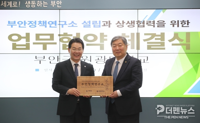 부안군은 24일 원광대학교와 업무협약(MOU)을 체결하고, 대학 내에 ‘부안정책연구소’ 사무실을 설치했다고 밝혔다. 이번 협약은 에너지·농생명·해양관광 등 부안군이 직면한 복합적인 정책 과제에 대해 보다 체계적이고 전문적인 연구 기반을 구축하기 위해 추진됐다.