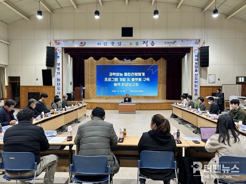 정읍시농업기술센터는 지난 23일 제2청사 대강당에서 ‘과학영농 통합관제체계 구축사업 완료보고회’를 개최했다. 이날 보고회에는 농촌진흥청 관계자와 외부 전문가, 담당 공무원, 실제 시스템을 이용할 관내 농가 등 30여 명이 참석해 성과를 공유하고 향후 확산 방안을 논의했다.