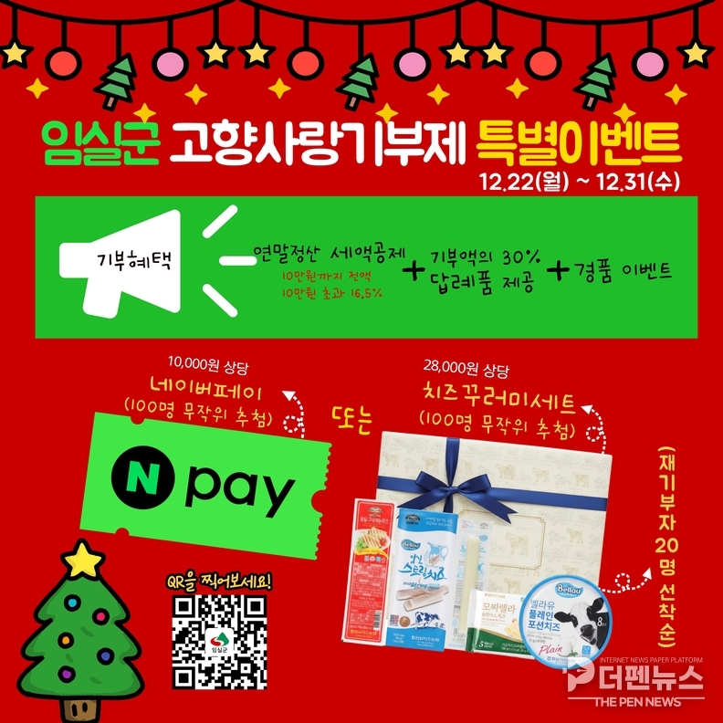 온라인 기부자를 위한 혜택도 강력하다. 고향사랑e음을 통해 임실군에 10만 원 이상 기부한 사람 중 200명을 추첨해 네이버페이 1만 원 상품권(100명) 또는 2만 8천 원 상당의 치즈 꾸러미 세트(100명)를 증정한다.