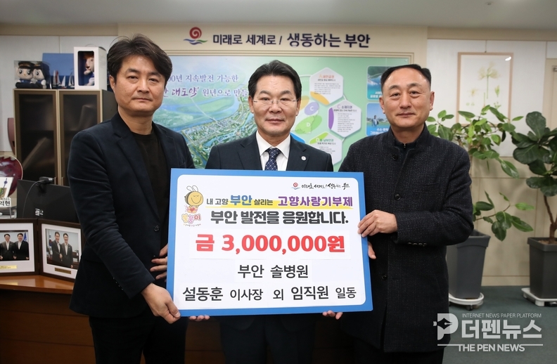 부안군은 의료법인 힐튼의료재단 솔병원 임직원 일동이 고향사랑기부제에 동참해 기부금 300만 원을 전달했다고 밝혔다.