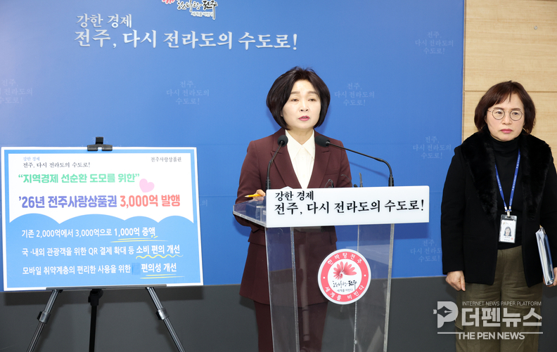 전주시는 26일 장기화된 경기 침체와 고물가로 어려움을 겪는 소상공인과 시민들의 부담을 덜기 위해 2026년 전주사랑상품권 발행 규모를 기존 2000억 원에서 3000억 원으로 50% 늘린다고 밝혔다. 이는 역대 최대 규모로, 보다 많은 시민이 혜택을 누릴 수 있도록 하기 위한 조치다.