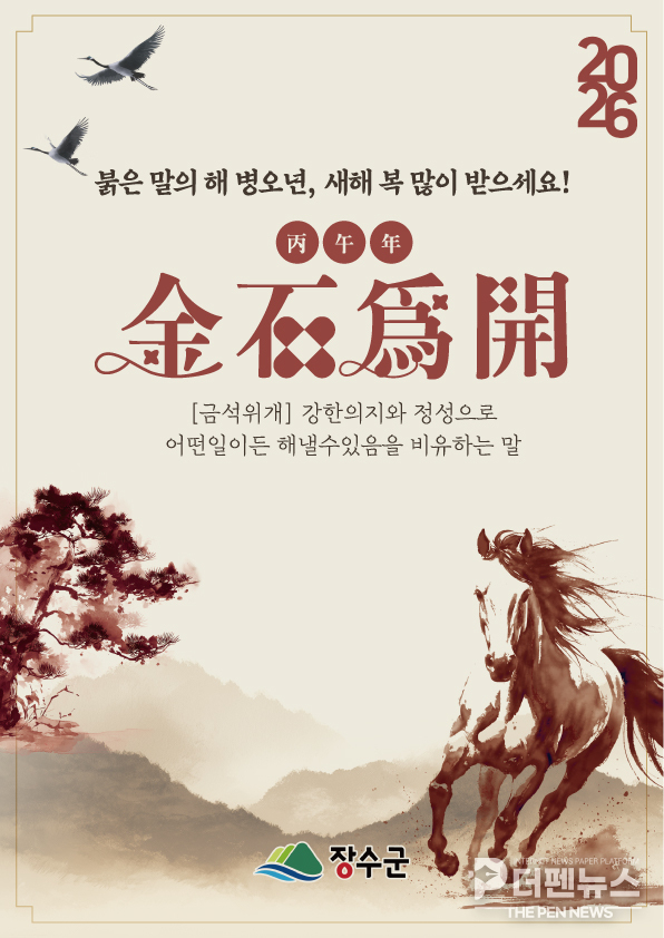 장수군이 2026년 새해 군정 운영의 방향을 상징하는 사자성어로 ‘금석위개(金石爲開)’를 선정했다. 강한 의지와 끈기 있는 실천으로 그동안 이뤄낸 성과를 미래 도약으로 잇겠다는 의미다.