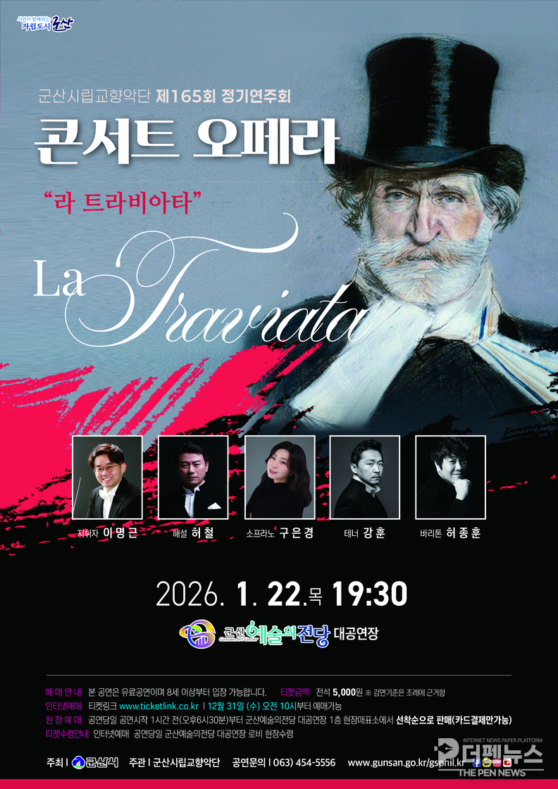 군산시립교향악단은 오는 1월 22일 오후 7시 30분 군산예술의전당 대공연장에서 제165회 정기연주회로 콘서트 오페라 ‘라 트라비아타’를 개최한다고 밝혔다.