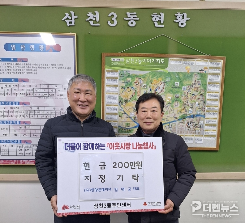 삼천3동 주민센터(동장 김주관)는 임 대표가 최근 주민센터를 방문해 관내 불우이웃을 돕기 위한 성금 200만 원을 기탁했다고 밝혔다.