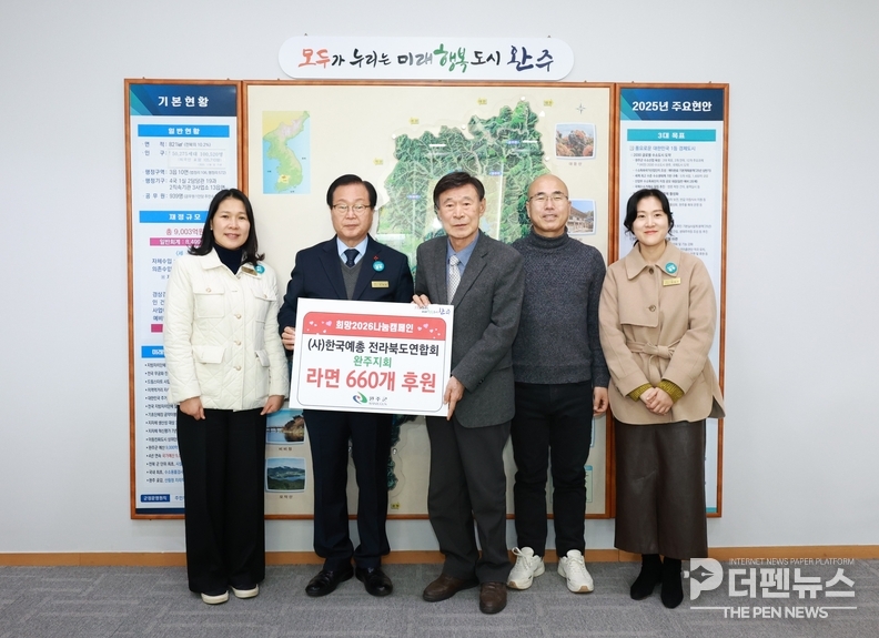 완주군은 (사)한국예총 전라북도연합회 완주지회(회장 전일환)가 최근 관내 취약계층 지원을 위해 라면 660개를 기탁했다고 밝혔다. 기탁된 물품은 도움이 필요한 이웃들에게 전달될 예정이다.