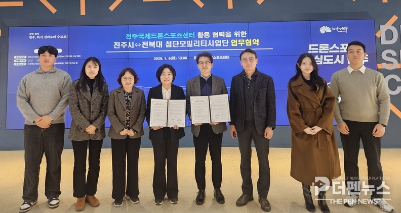 전주시와 전북대학교 첨단모빌리티사업단(사업단장 이덕진 교수)은 6일 전주국제드론스포츠센터에서 임숙희 전주시 경제산업국장과 이덕진 단장 등 양 기관 관계자들이 참석한 가운데 드론 분야 상호 협력을 위한 업무협약(MOU)을 체결했다.