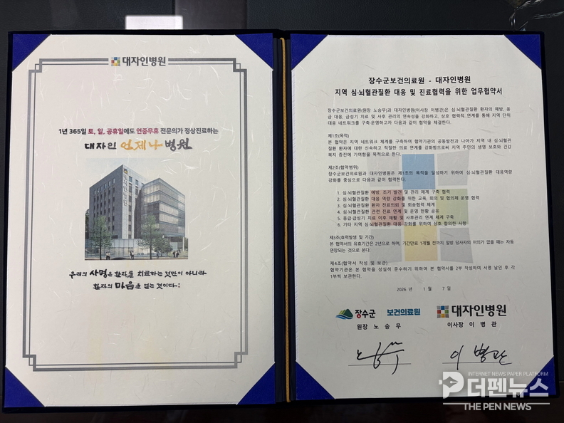 장수군은 9일 대자인병원과 심뇌혈관질환 발생 시 신속하고 효과적인 대응을 위한 ‘심뇌혈관질환 대응 진료협력 협약(MOU)’을 체결했다고 밝혔다. 이번 협약은 지역 내 증가하고 있는 심뇌혈관질환 환자에 대해 예방부터 응급 대응, 급성기 치료, 재활 및 사후관리까지 전 과정에 걸친 협력 체계를 구축하기 위해 마련됐다.