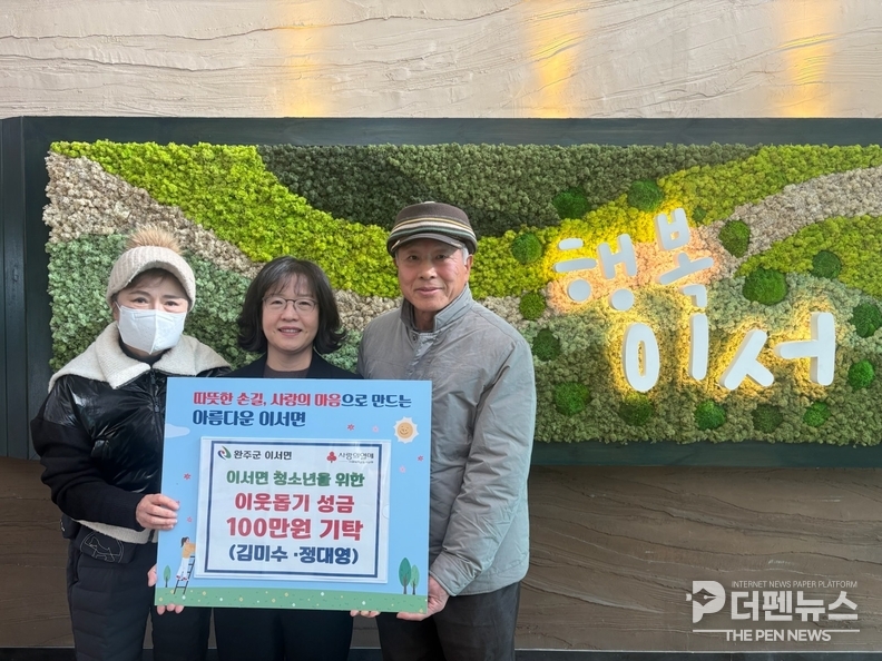 완주군 이서면은 김미수·정대영 부부가 관내 취약계층 아동들을 위해 써달라며 성금 100만 원을 기탁했다고 밝혔다. 이번에 전달된 성금은 경제적 어려움으로 학습과 생활 전반에서 도움이 필요한 지역 내 아동들을 지원하는 데 사용될 예정이다.