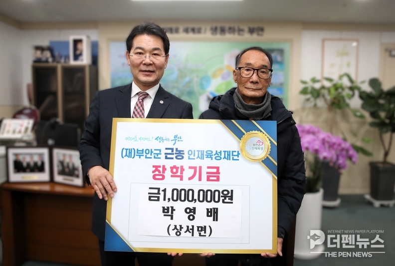 부안군 근농인재육성재단은 박영배 씨가 재단을 방문해 장학금 100만 원을 기탁했다고 밝혔다. 기탁된 장학금은 지역 학생들의 학업 지원과 미래 인재 양성을 위한 재원으로 활용될 예정이다.