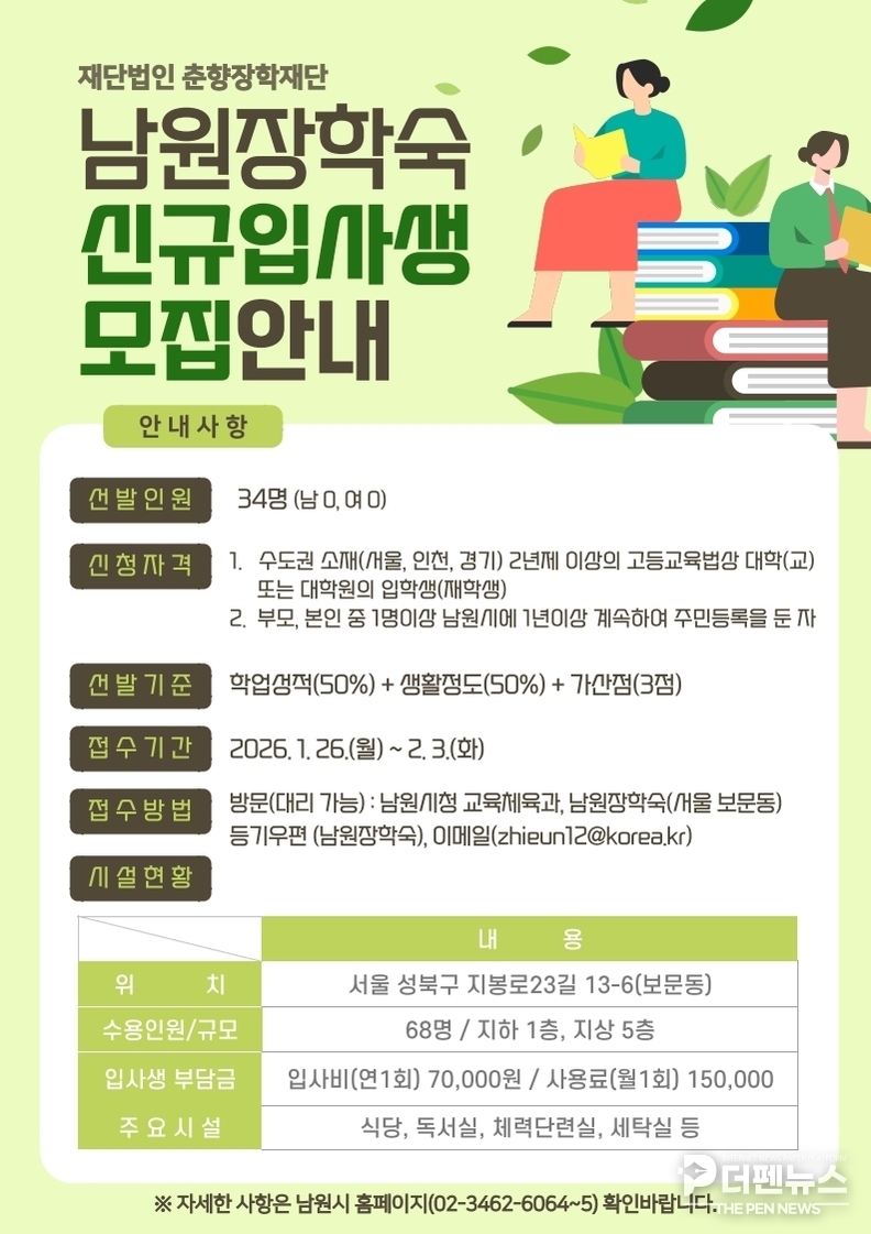 재단법인 춘향장학재단이 운영하는 남원장학숙이 2026년도 신규입사생을 모집한다.