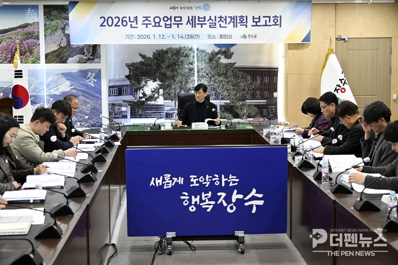 장수군은 지난 12일부터 14일까지 사흘간 군청 회의실에서 ‘2026년 업무계획 보고회’를 열고 올해 추진할 핵심 과제와 중점 사업을 점검·공유했다고 밝혔다. 이번 보고회에는 최훈식 군수를 비롯해 이정우 부군수, 국·소장과 20개 부서 부서장 및 팀장이 참석했다.