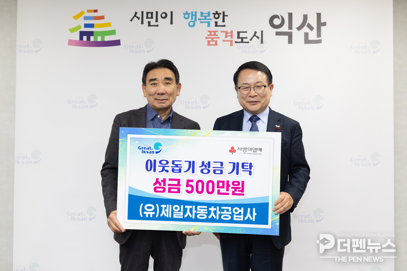 익산시는 14일 송학동에 위치한 (유)제일자동차공업사로부터 이웃돕기 성금 500만 원을 기탁받았다고 밝혔다.