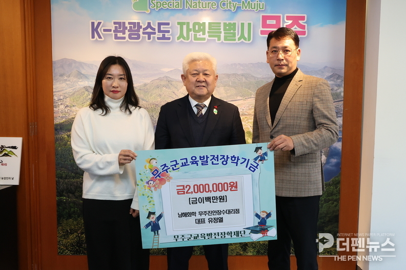 남해화학 무주진안장수대리점 유정열 대표는 지난 14일 (재)무주군교육발전장학재단에 장학금 200만 원을 기탁했다. 이번 기탁은 지역 학생들이 환경과 여건에 구애받지 않고 학업에 전념할 수 있도록 돕기 위해 마련됐다.