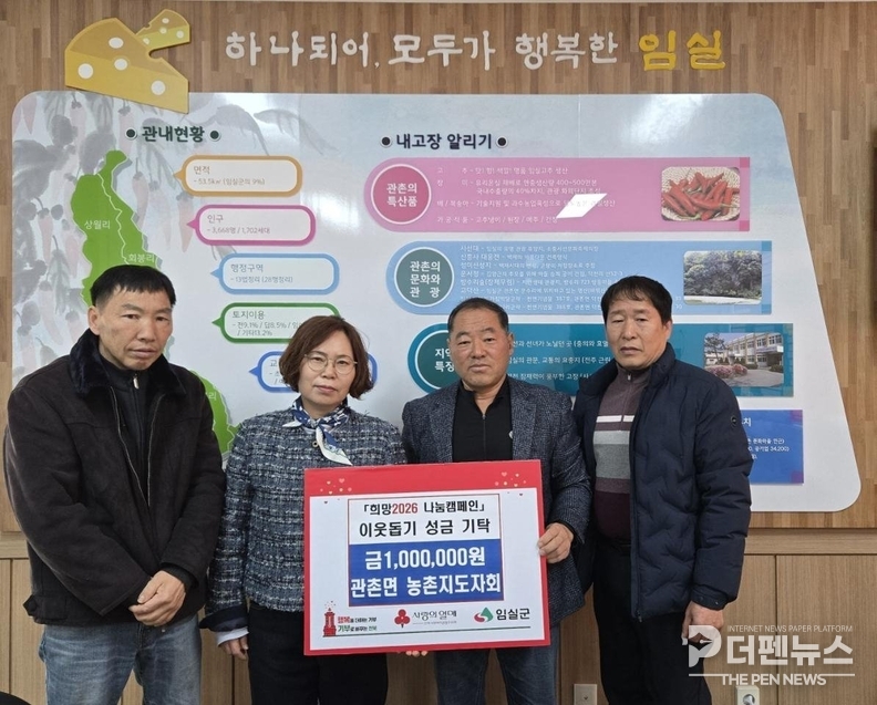 19일 임실군 관촌면은 농촌지도자회(회장 이장래)가 지난 14일 면사무소를 방문해 취약계층을 위한 이웃돕기 성금 100만 원을 기탁했다고 밝혔다.