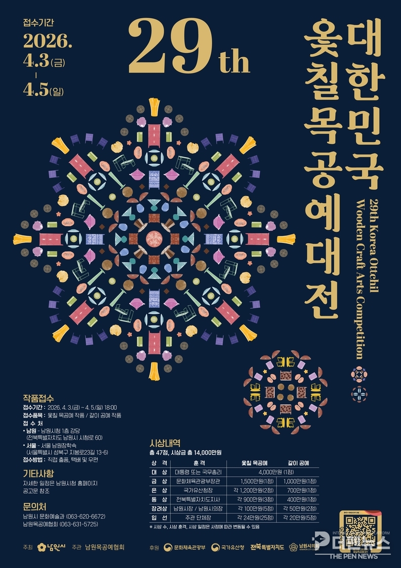 수상자는 4월 15일 남원시 홈페이지를 통해 발표될 예정이다. 시상식은 제96회 남원 춘향제 기간 중 ‘남원 안숙선명창의 여정’에서 열린다. 수상작은 이후 남원 전시를 시작으로 전주 한옥마을 공예품전시관, 2026 공예트렌드페어 등 국내 주요 전시를 통해 선보일 계획이다.