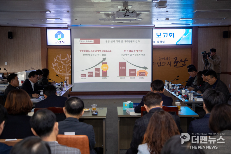 군산시는 20일 시청 상황실에서 강임준 시장 주재로 ‘2026년 주요업무계획 보고회’를 열고, 내년도 시정 운영 방향과 부서별 핵심 추진과제를 종합 점검했다. 이날 보고회에는 2026년도 본예산 확정 이후 주요 사업을 전반적으로 재점검하고, 실효성 있는 시정 운영 방향을 정비하겠다는 의지가 담겼다.