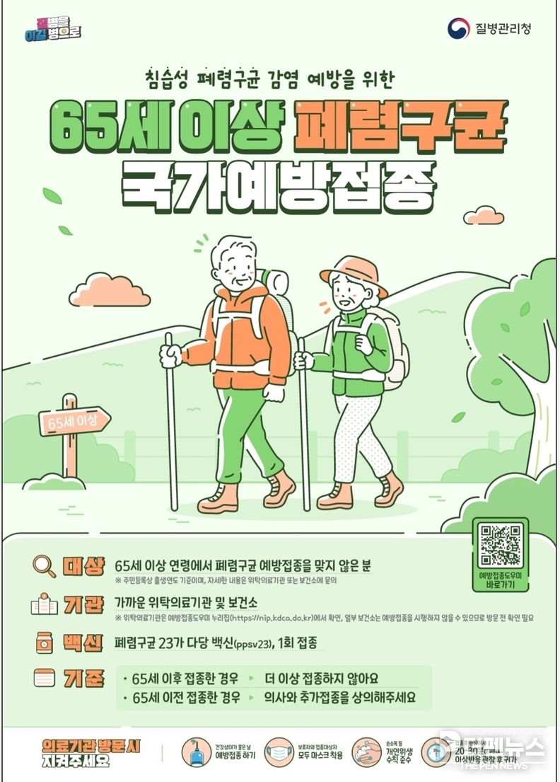 폐렴은 국내 사망 원인 중 높은 비중을 차지하는 질환으로, 특히 고령층에서 위험성이 크다. 다만 65세 이상 연령대에서는 평생 한 차례 접종만으로도 폐렴구균에 의한 침습성 감염증인 패혈증과 뇌수막염 등을 50~80%까지 예방할 수 있어 적기 접종의 중요성이 강조되고 있다.