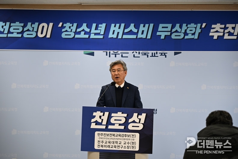 천호성 전주교육대학교 교수는 전북교육감 공약으로 아동·청소년 버스비 무상화 정책을 추진하겠다고 밝혔다. 천 교수는 “이동할 수 있어야 배울 수 있고, 성장할 수 있다”며 “아동·청소년의 진로탐색과 지역 탐방을 위한 이동권 보장은 교육의 기본 조건”이라고 강조했다.