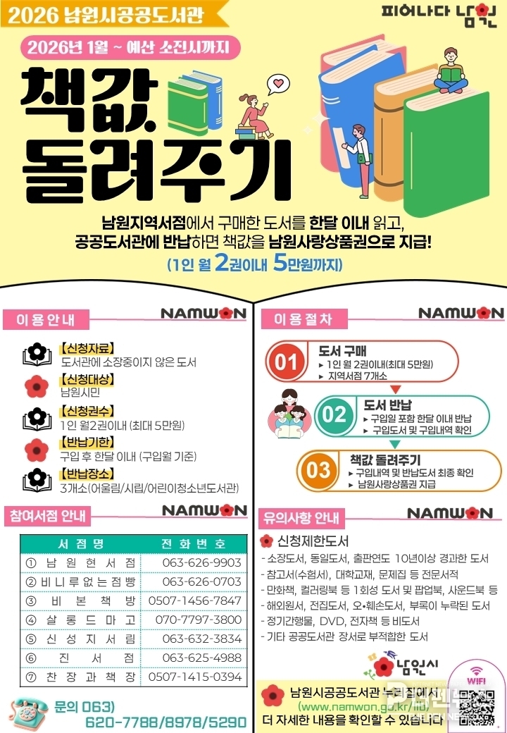 남원시 관계자는 “책값 돌려주기 사업 확대를 통해 시민들의 독서 접근성이 높아지고, 도서관과 지역서점 간 상생 협력도 강화될 것으로 기대한다”며 “앞으로도 시민 의견을 적극 반영해 독서문화 확산과 지역서점 활성화를 함께 이끌어 가겠다”고 말했다.