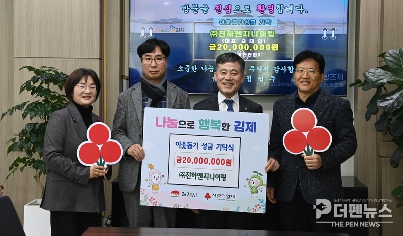 정성주 김제시장은 “오랜 기간 꾸준한 나눔을 실천해 주신 진하엔지니어링에 깊이 감사드린다”며 “기탁된 성금은 도움이 절실한 이웃들에게 소중히 전달하겠다”고 밝혔다.